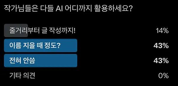 작가님들은 AI를 어떤 때에 활용하시는지 궁금해서 한 투표에서 이름 지을 때 사용을 하신다는 의견이 있었습니다.
