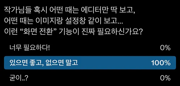 "글 쓸 때 다른 거 다 안 보이게 해주세요." 집필에 집중하고 싶은데 다른 메뉴들을 가릴 수 없냐는 의견이 있었습니다.