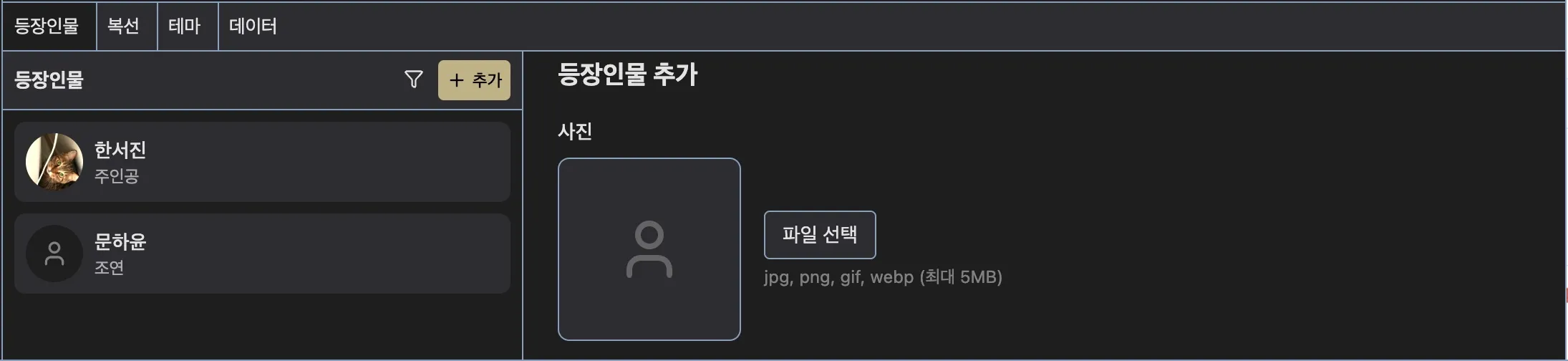 등장인물 관리로 캐릭터의 이름, 성격, 외모, 관계도 등을 체계적으로 관리하고, 글 쓰다가 바로 참고할 수 있습니다.