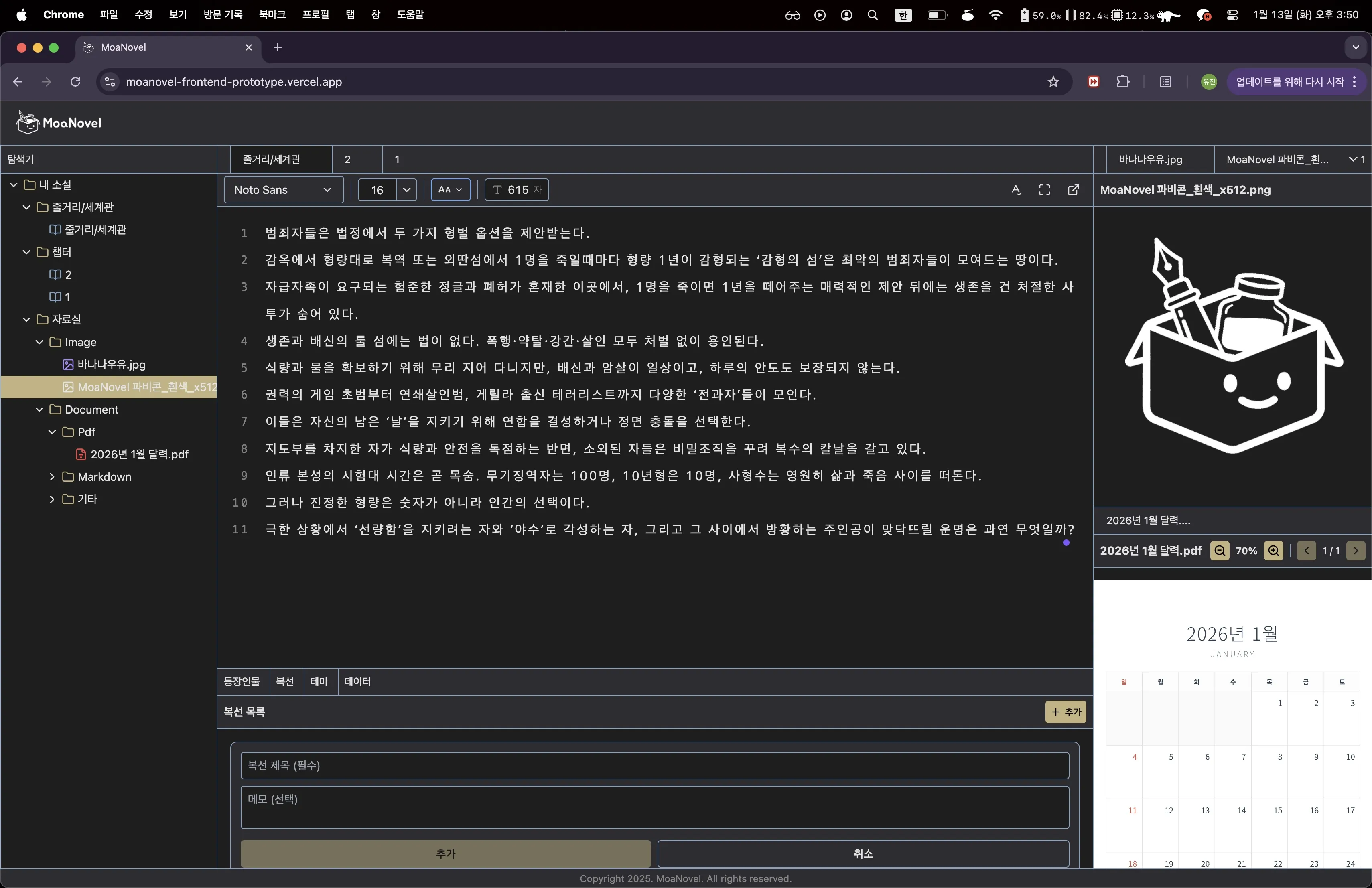 미니멀 에디터는 불필요한 UI 요소를 제거하고, 글쓰기에만 집중할 수 있게 설계했습니다. 이미지나 PDF 같은 참고 자료를 한 화면에서 확인하며 집필할 수 있죠.