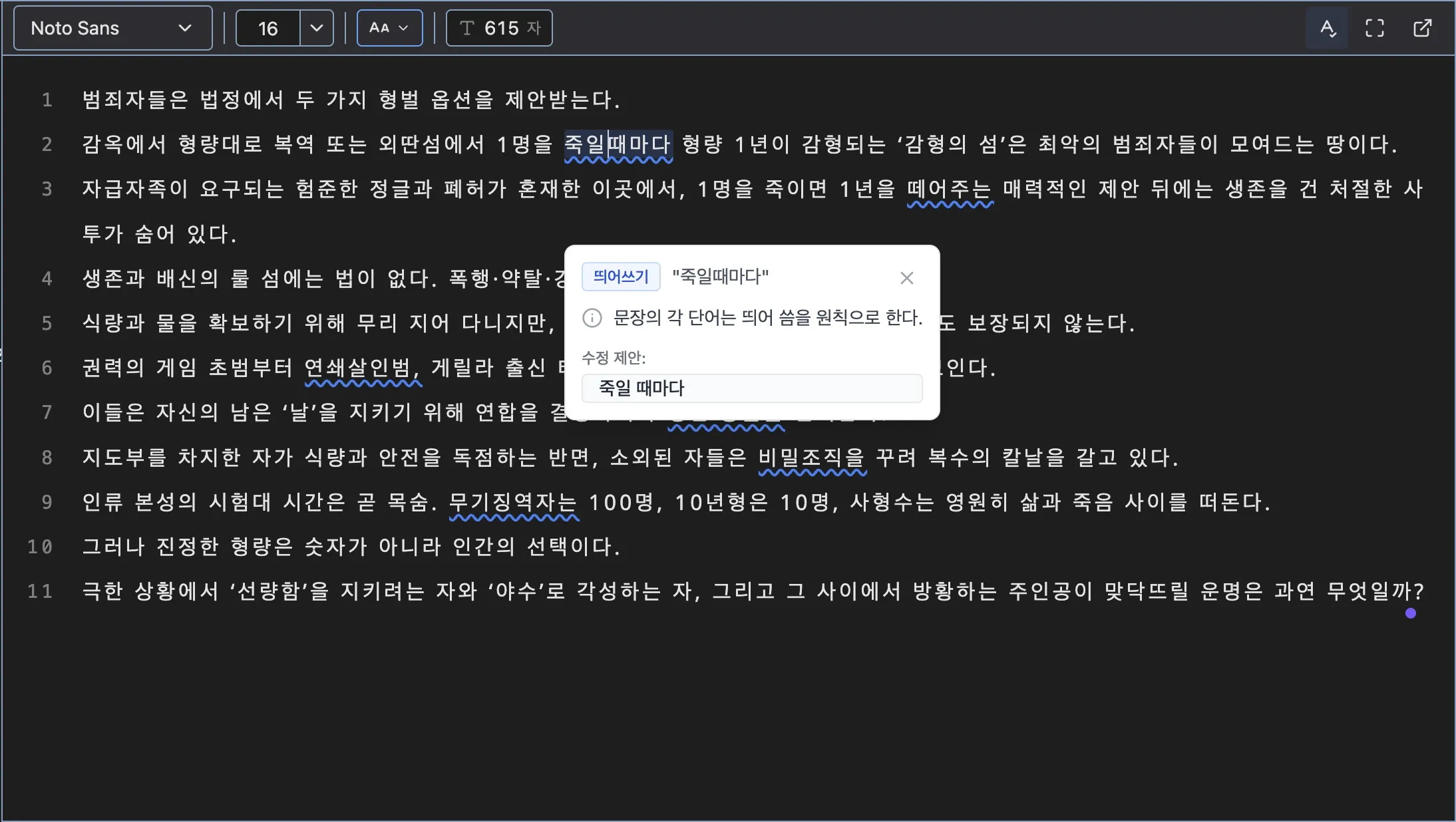 맞춤법 검사로 오타와 문법 오류를 체크합니다.
