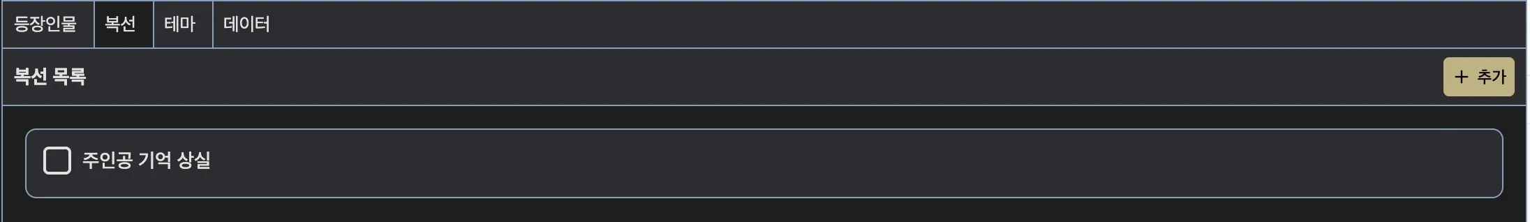 복선 저장 기능으로 스토리 전개 중 흩어진 복선들을 한곳에 정리하고, 챕터별로 어떤 복선을 깔았는지 추적할 수 있습니다.