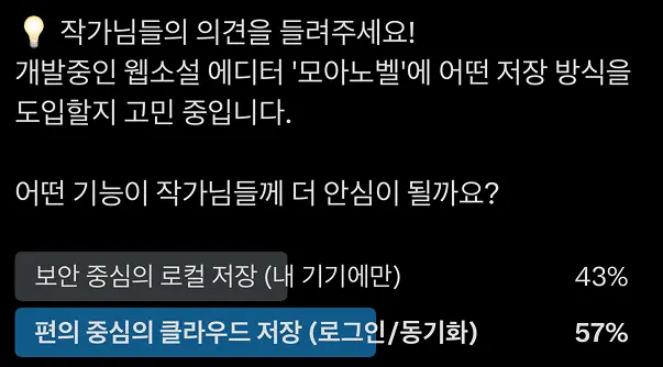 현재 모아노벨은 로컬저장과 백업 기능이 구현된 상태입니다. 클라우드 저장이 필요할지 고민이 되는 와중, 투표를 진행해보기로 했습니다.