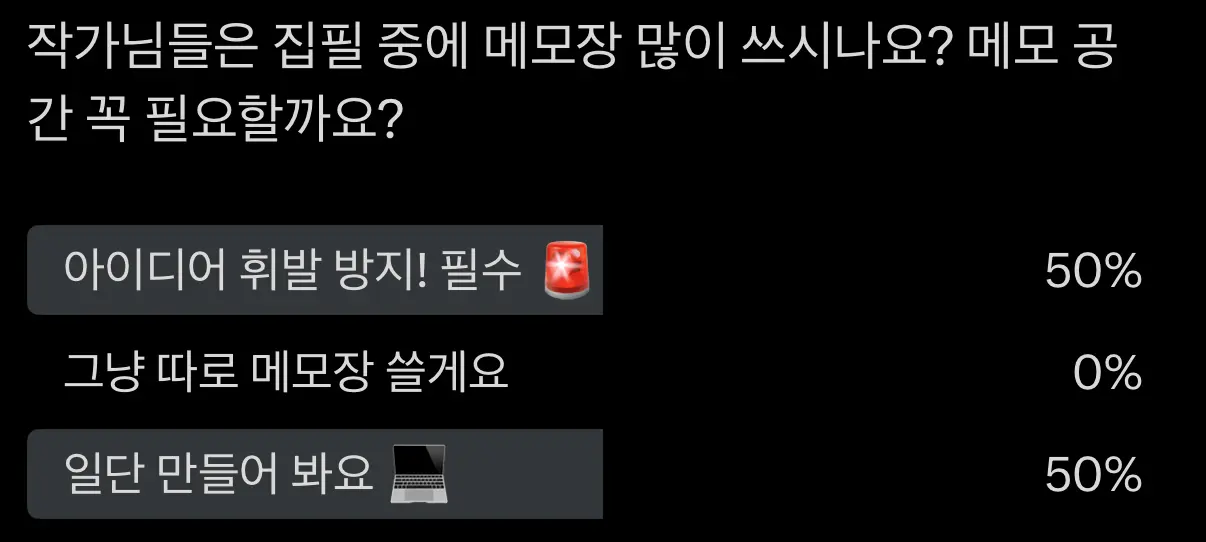 웹소설을 쓰다 보면 수시로 메모할 거리가 생긴다고 하더라구요. 현재 등장인물 설정, 복선 관리 등의 레이아웃이 추가되어 있는데 이 외에도 메모장이 필요하다는 의견이 있어 투표를 진행해보았어요.