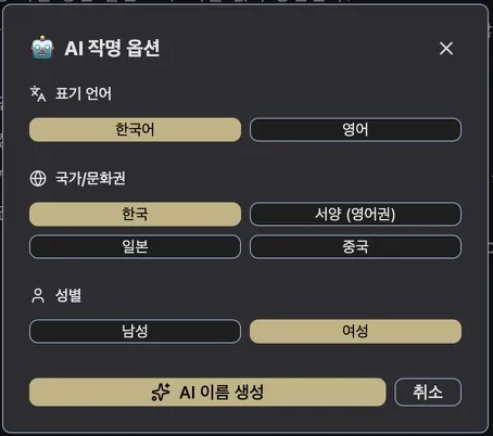 AI 캐릭터 작명으로 캐릭터 성별과 국적에 맞는 이름을 제안받을 수 있습니다.
